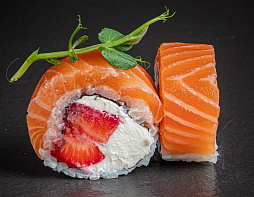 Ролл филадельфия с лососем и клубникой в кунжуте