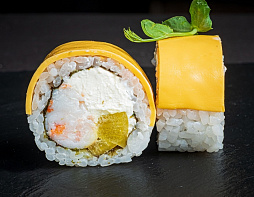 Ролл с креветкой, сливочным сыром, такуаном в сыре чеддер