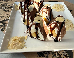 Блинчик десертный шоколадный, сыр сливочный десертный, киви свежий, персик консервированный, шоколадный топпинг, миндальные слайсы.