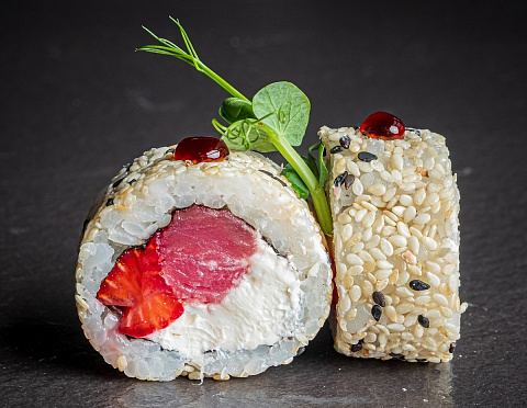 Ролл Филадельфия Магуро с клубникой в кунжуте