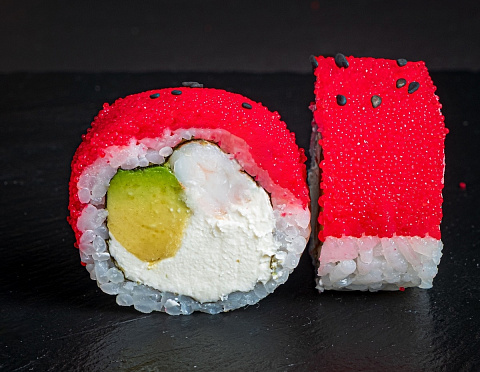 Ролл с креветкой, авокадо, сливочным сыром и икрой масаго
