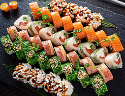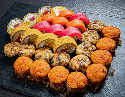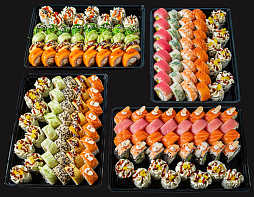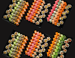 - ролл в тунце с тигровой креветкой, авокадо, сливочным сыром – 8 шт. - ролл в лососе со сливочным сыром – 4 шт. - ролл с лососем, огурцом и сливочным сыром в кунжуте – 4...