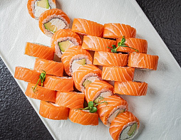 - ролл Филадельфия Авокадо в лососе, с авокадо и сливочным сыром – 8 шт. - ролл Филадельфия Каппа в лососе, с огурцом и сливочным сыром – 8 шт. - ролл Филадельфия с клубн...