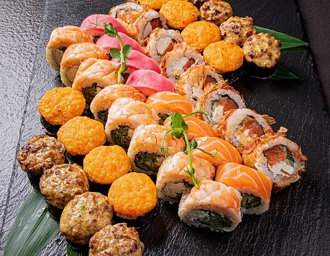 - ролл "Филадельфия Каппа": лосось, огурец, сыр, нори, рис - 4 шт. - ролл "Филадельфия Магуро": тунец, огурец, сыр, нори, рис - 4 шт. - ролл "Запеченный с креветкой": креветка, сыр, салат айсберг, смесь для запекания краб-микс с пармезаном, рис, нори - 8 шт. ролл «Запеченный с угрем и пармезаном»: огурец, такуан, салат айсберг, смесь для запекания с угрем и пармезаном, нори, рис – 8 шт. - ролл "Эверест Фреш": тигровая креветка, белый кунжут, огурец, салат айсберг, сыр, рис, нори - 8 шт. - ролл "Бонито с лососем и огурцом": лосось, огурец, сыр, стружка тунца, нори, рис - 8 шт.