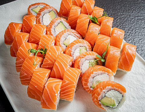 ролл Филадельфия Авокадо в лососе, с авокадо и сливочным сыром – 8 шт.; ролл Филадельфия Каппа в лососе, с огурцом и сливочным сыром – 8 шт.; ролл Филадельфия c клубникой в лососе, с клубникой и сливочным сыром – 8 шт.; ролл Филадельфия Сяке в лососе со сливочным сыром – 8 шт.