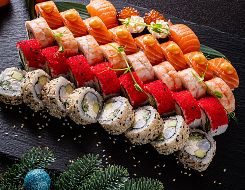- ролл "Филадельфия ШИК": лосось, сыр, соус манго-чили, нори, рис - 8 шт. - ролл "Филадельфия с креветкой": креветка тигровая, огурец, сыр, нори, рис - 8 шт. - ролл «Этна Лосось»: лосось, авокадо, сыр, икра масага, нори, рис – 8 шт. - ролл "Калифорния с креветкой": креветка тигровая, авокадо, сыр, огурец, кунжут, нори, рис - 8 шт. - Гункан с лососевой икрой и сырным крем-муссом - 2 шт. - нигири с лососьем – 2 шт.