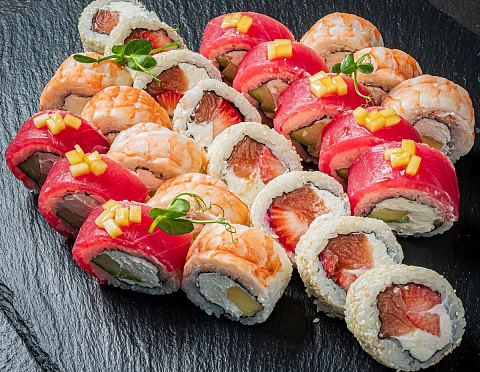 ролл Филадельфия Магуро с авокадо и сливочным сыром и манго-чатни – 8 шт.; ролл в креветке со сливочным сыром и манго - 8 шт.; ролл Филадельфия с лососем и клубникой в кунжуте - 8 шт.