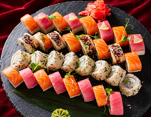 - ролл "Филадельфия Авокадо": лосось, огурец, сыр, нори, рис - 8 шт. - ролл "Ролл Филадельфия Магуро": тунец, сыр, огурец, нори, рис - 8 шт. - ролл "Филадельфия Каппа": лосось, огурец, сыр, нори, рис - 4 шт. - ролл "Калифорния в кунжуте": креветки тигровые, авокадо, огурец, сыр, кунжут, нори, рис – 8 шт. - ролл "Черный дракон": угорь, авокадо, огурец, сыр, соус терияки, кунжут, нори, рис - 4 шт.
