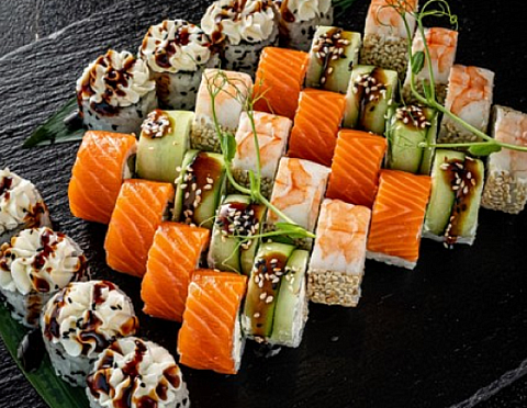 - ролл в лососе со сливочным сыром и огурцом - 8 шт. - ролл в креветке и кунжуте со сливочным сыром, японским омлетом и грибами шиитаке - 8 шт.) - ролл в огурце с тунцом, сливочным сыром, такуаном, кунжутом, соусом терияки - 8 шт - ролл в кунжуте со сливочным сыром, крем-крабом, такуаном и соусом терияки - 8 шт.
