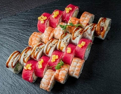 - ролл Черный дракон с угрем, сливочный сыром, огурцом, авокадо, соусом терияки и кунжутом – 8 шт. - ролл в креветке со сливочным сыром и манго - 8 шт. - ролл Филадельфия Магуро с авокадо и сливочным сыром и манго-чатни – 8 шт.
