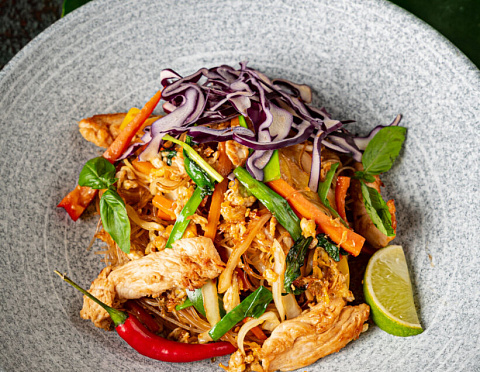 Филе цыплёнка, стеклянная лапша, болгарский перец, морковь, капуста, яйцо, лук, краснокачання капуста, соус пад-кхи-мао, лайм